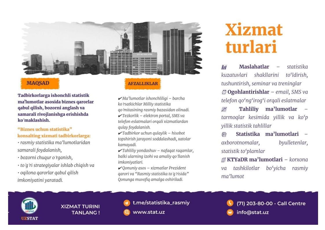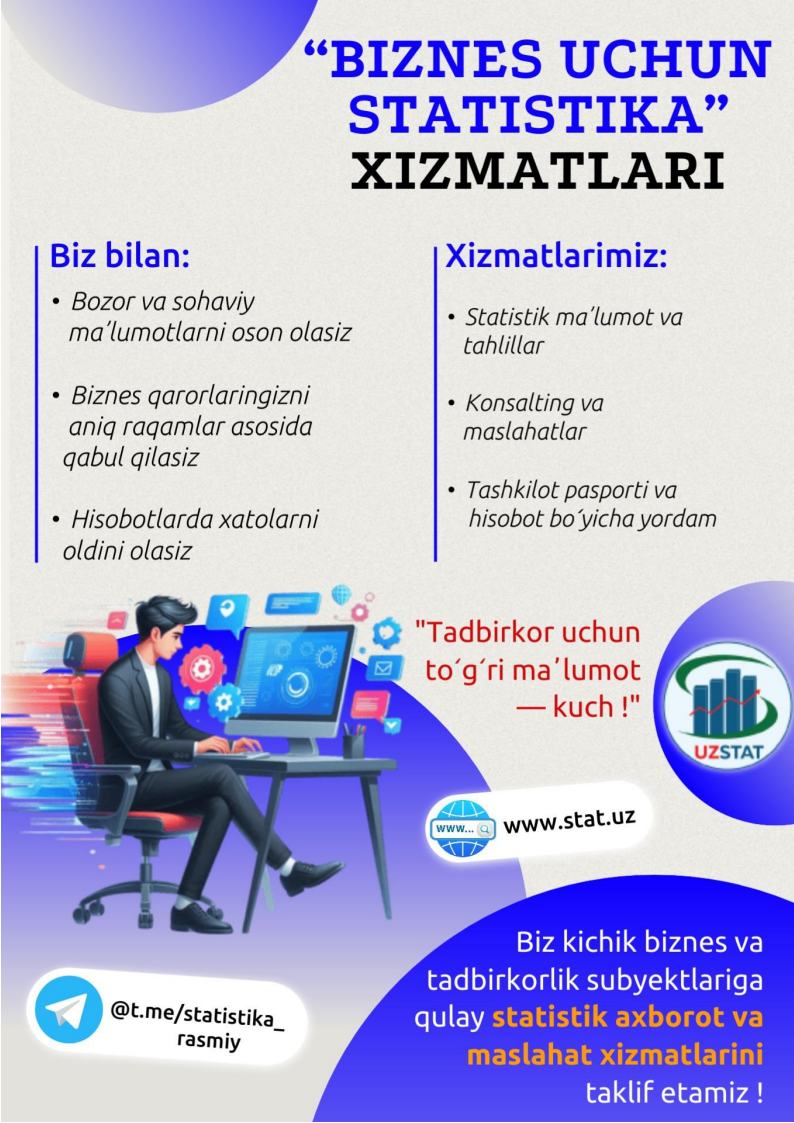 O‘zbekiston Respublikasi Prezidentining 2025-yil 24-fevraldagi "O‘zbekiston Respublikasi Milliy statistika qo‘mitasi faoliyatini tashkil etish chora-tadbirlari to‘g‘risida" PQ-75-son qaroriga muvofiq statistika tizimidagi tashkilotlarda "Biznes uchun statistika" konsalting xizmati joriy etildi.