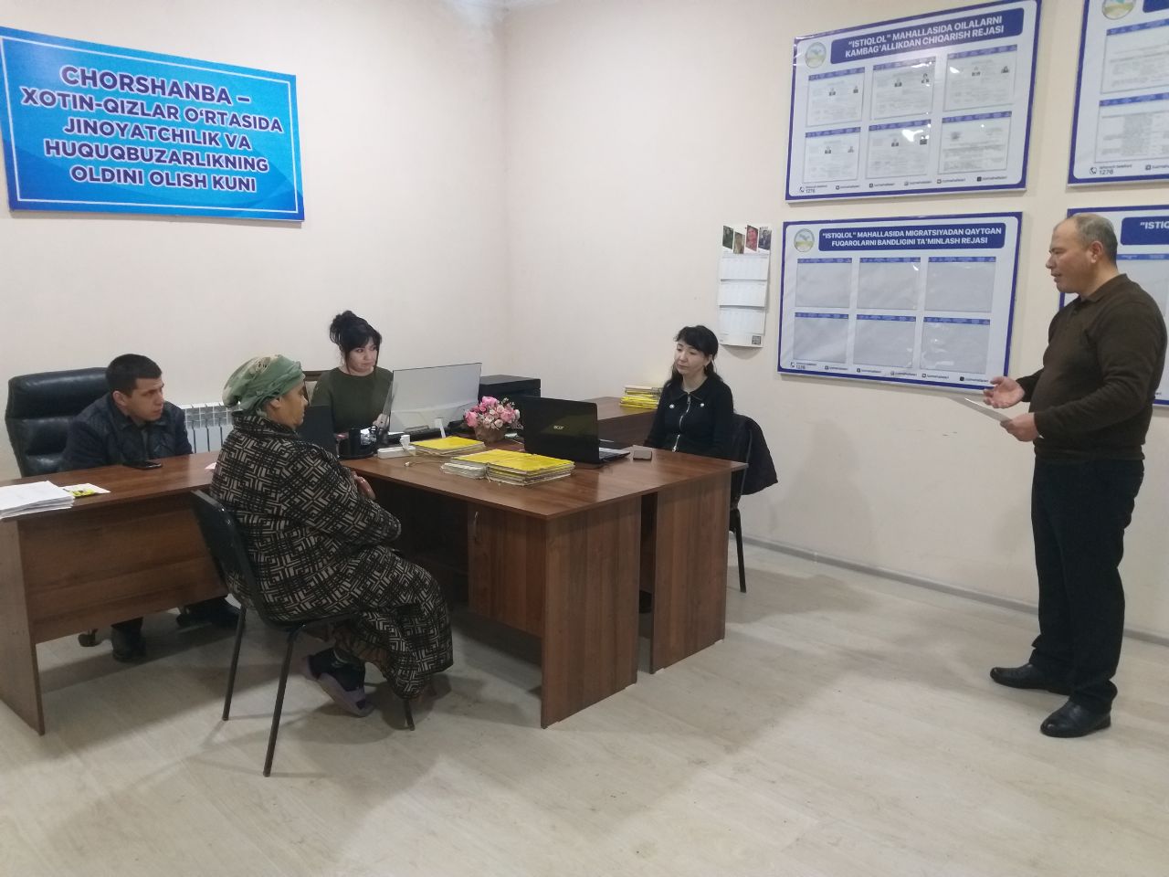 Shu boisdan idora va tashkilotlar hamda mahalla fuqarolar yig‘inlarida har haftada huquqiy targ‘ibot tadbirlari o‘tkazib borilmoqda.