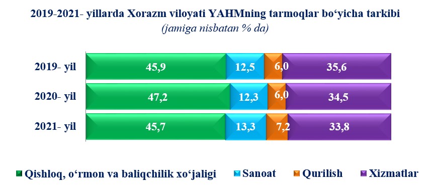 2021- yil yakunlariga ko‘ra, Xorazm viloyatida qishloq, o‘rmon va baliqchilik xo‘jaligining YAHM tarkibidagi ulushi 45,7 % ni, sanoat – 13,3 % ni, qurilish – 7,2 % ni va xizmatlar sohasi – 33,8 % ni tashkil etdi.