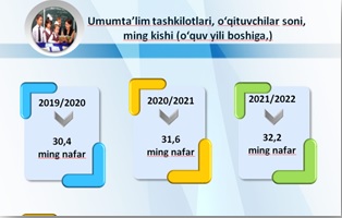 2021/2022- o‘quv yili boshiga viloyatimizda faoliyat ko‘rsatayotgan umumta’lim tashkilotlarida (567 ta) jami 32,2 ming nafar o‘qituvchi (o‘rindoshlarsiz) faoliyat olib borgan.