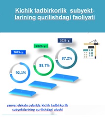 2021- yil yanvar-dekabr oylarida kichik tadbirkorlik subyektlari tomonidan amalga oshirilgan qurilish ishlari hajmi umumiy hajmning 87,2% ni tashkil etgan.