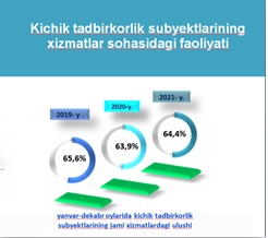 2021- yil yanvar-dekabr oylarida kichik tadbirkorlik subyektlari tomonidan 5 387,5 mlrd. so‘mlik xizmatlar ko‘rsatilgan bo‘lib, 2020- yil yanvar-dekabr oylariga nisbatan ko‘rsatilgan xizmatlar hajmining 20,5 % ga oshgani kuzatilgan.