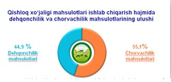 Dastlabki ma’lumotlarga ko‘ra, 2021– yilning yanvar– dekabrida viloyatda barcha toifadagi xo‘jaliklar tomonidan ishlab chiqarilgan qishloq xo‘jaligi mahsulotlari hajmi 19 397,1 mlrd. so‘mni tashkil qilgan.