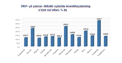 2021- yilda yanvar-dekabr oylarida viloyat hududlari orasida asosiy kapitalga o‘zlashtirilgan investitsiyalar hajmining 2020- yilning shu davriga nisbatan eng yuqori o‘sish sur’ati Yangiariq (329,7 %), Hazorasp (254,3 %) tumanlarida, Xiva shahri (228,9 %) va Xiva tumanida (197,0 %) qayd etilgan.