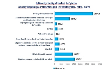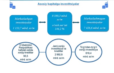 2021- yilning yanvar-dekabr oylarida viloyatda asosiy kapitalga o‘zlashtirilgan investitsiyalar hajmi 8 580,3 mlrd. so‘mni tashkil qilgan.