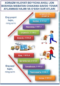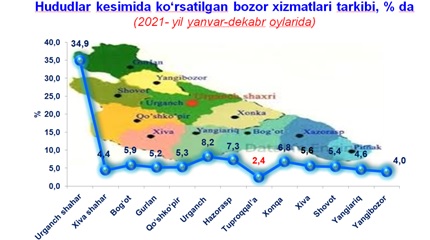 2021- yilning yanvar-dekabr oylarida ko‘rsatilgan bozor xizmatlari umumiy hajmida hududlar bo‘yicha eng katta ulush Urganch shahri - 34,9 %, Urganch tumani – 8,2 %, Hazorasp tumani – 8,2 % va Xonqa tumani -6,8 % hissasiga to‘g‘ri kelgan.
