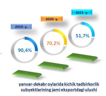 Dastlabki ma’lumotlarga ko‘ra, 2021- yilning yanvar-dekabrida oylarida kichik biznes subyektlarining mahsulot (ishlar va xizmatlar) eksporti hajmi 119,2 million AQSh dollarini yoki umumiy eksport hajmining 51,7% ini tashkil etdi.