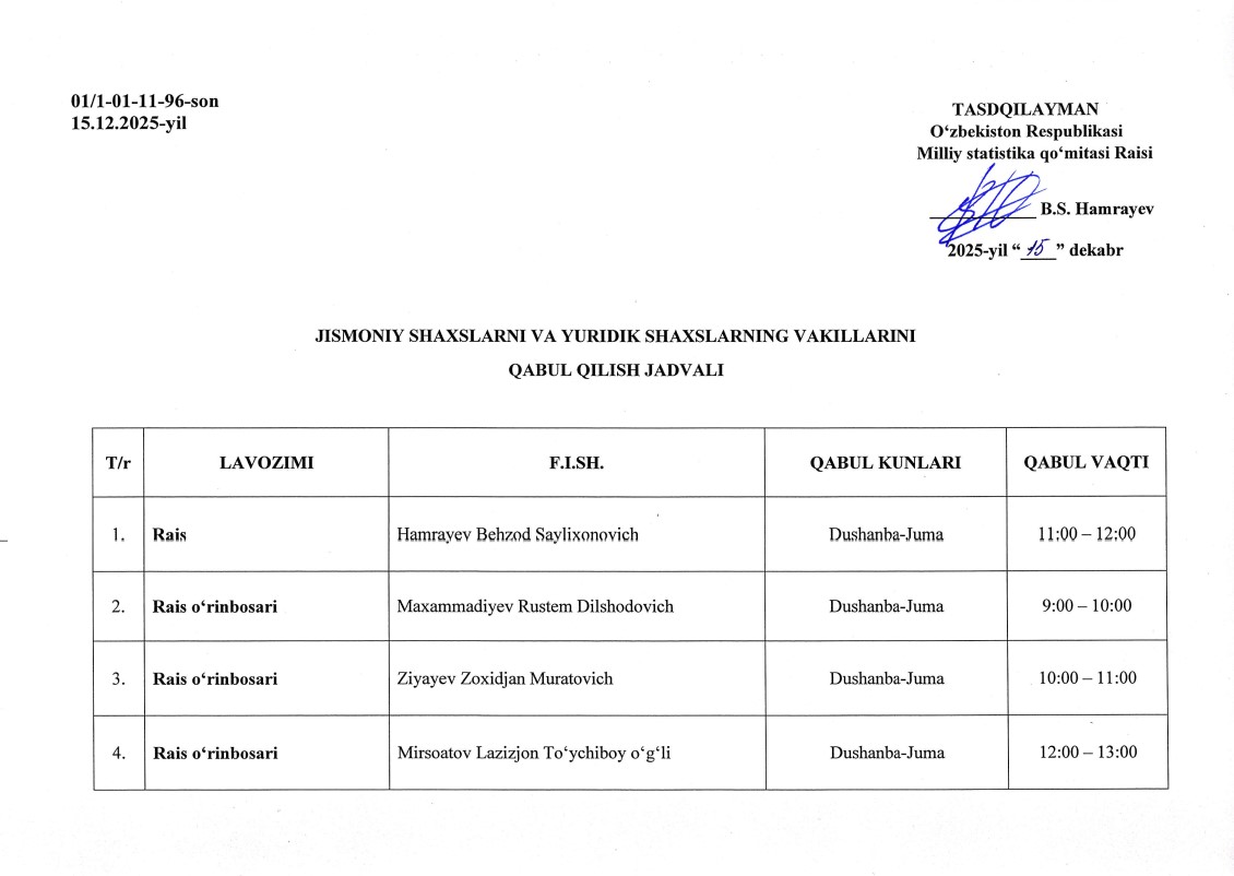 O'zbekiston Respublikasi Milliy statistika qo'mitasi rahbariyatining jismoniy shaxslarni va yuridik shaxslarning vakillarini qabul qilish jadvali