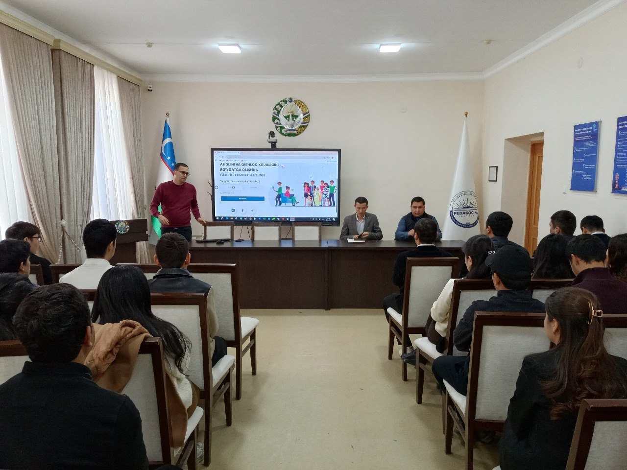 Oliy ta’lim muassasasi talabalari o‘rtasida aholi va qishloq xo‘jaligini ro‘yxatga olish tadbirining targ‘ibotiga yo‘naltirilgan ushbu seminarda, 2026- yilning 15- yanvaridan 28- fevraliga qadar mamlakatimizda o‘tkaziladigan aholi va qishloq xo‘jaligini ro‘yxatga olish tadbirining maqsad va ahamiyati, o‘tkazilish tartibi, amalga oshirish bosqichlari, savolnomalarga to‘g‘ri va to‘liq javob berishning muhimligi bo‘yicha ma’lumotlar berildi.
